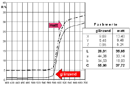 Die untere Kurve mag an einer hochglänzenden, sehr kräftigen roten Lackierung gemessen sein. L = 28 und C = 56. Durch die Parallelverschiebung um 4%-Punkte nach oben bei Messung mit der Kugelgeometrie 8°/d oder durch Zusatz eines Mattierungsmittels ohne aufhellende Wirkung (Wachs), steigt L um 9 Punkte an und das Chroma C fällt von 56 auf 37,7!
