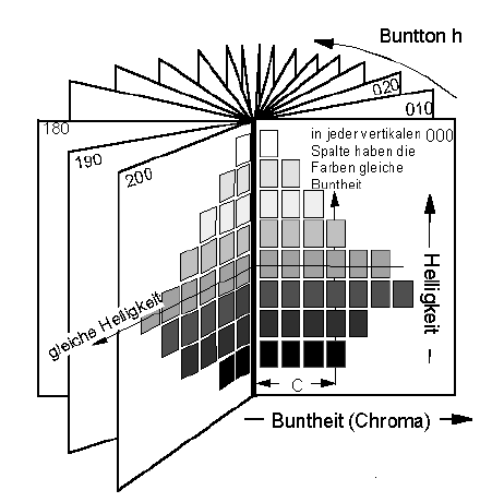 Von Seite zu Seite ändert sich der Buntton h um 10°, lediglich im Bereich zwischen h = 70 und h = 100 in 5er-Schritten, weil dort Bunttondifferenzen stärker empfunden werden. Zwischen den Helligkeitszeilen besteht jeweils ein DL von 10 und zwischen Spalten gleicher Buntheit ein DC = 10 bzw. DC = 5, wenn das maximal bei einem Buntton erreichbare C nur etwa 40 beträgt wie z.B. im Blaubereich.