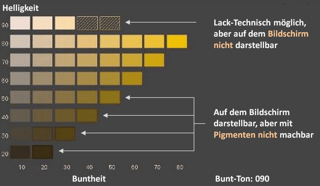 Sehr helle Gelbtöne (hier: 090) mit höherer Buntheit (Chroma) sind auf dem Bildschirm nicht darstellbar! Hingegen können relativ hoch gesättigte, "chromareiche" Olivtöne zwar auf dem Bildschirm, aber nicht lacktechnisch erzeugt werden.